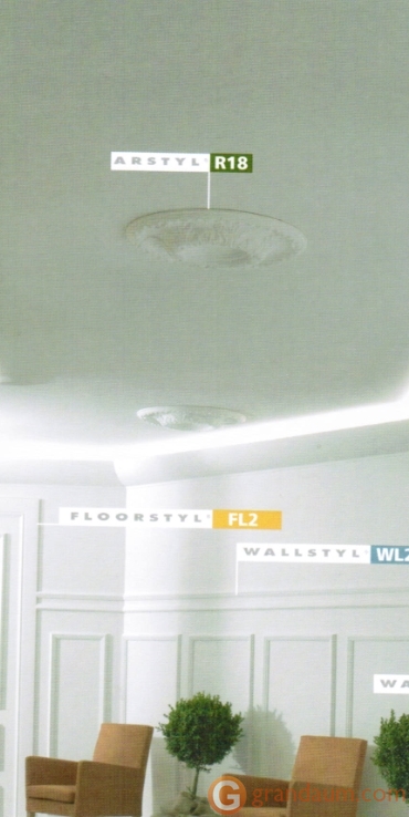 При использовании R18 в качестве основания для светильников, просверлите отверстие в плоском центральном круге. Потолочная розетка R18 ARSTYL® поставляется загрунтованной и готовой к покраске в окончательный цвет. Чтобы закрепить R18, просто приклейте потолочную розетку клеем Adefix.